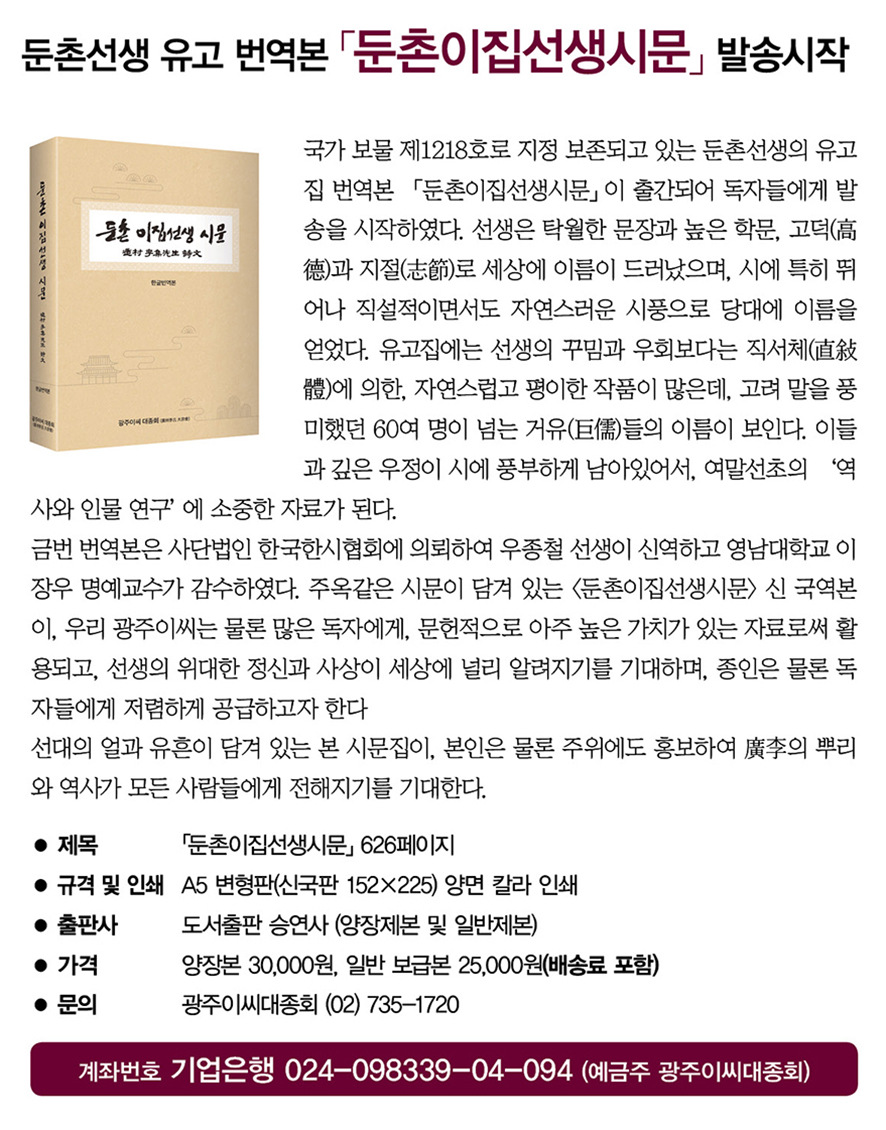 둔촌선생 유고 번역본 「둔촌이집선생시문」 발송시작