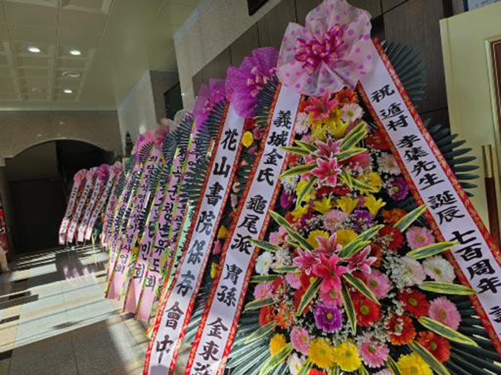 둔촌 이집 선생 학술대회 안내 배너와 화환들