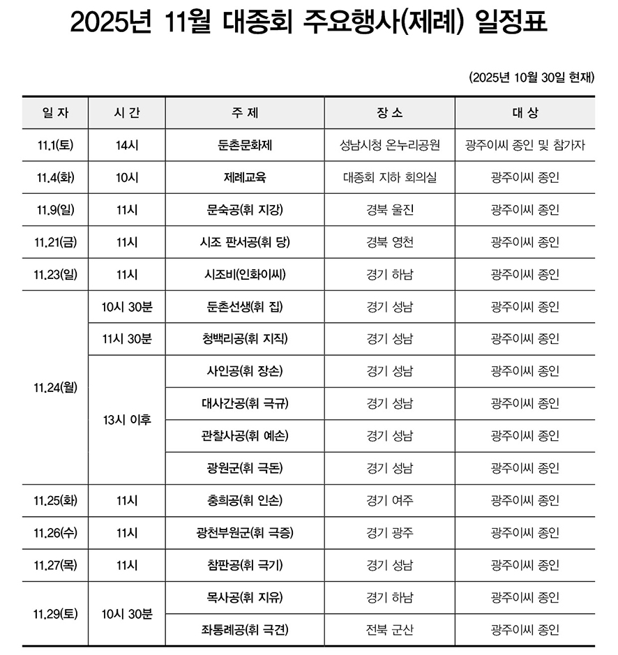 2025년 11월 대종회 주요(제례)행사 일정표