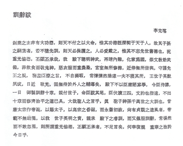 殿下는 文敎를 崇尙하고 武備를 갖추고 飮食과 衣服까지도 素朴하게 하시고 또 官室도 好奢코저 아니하며 先王의 規訓을 조금도 어긋난데 없이 삼가히 지키시면서 慊慊히 百姓 한 사람이라도 그 살바를 얻지 못할까 念慮하시고 또 世子께서는 역시 英特하고 夙成하여 外人의 輔導를 期待할 것이 없으며 殿下는 臣의 옹졸하고 고루하며 아는것 조차 없는 것을 탓하지 아니하고 侍講을 命하고 또 어느 날 御製訓辭 十章을 世子에게 내리시며 臣에게 跋文을 命하기로 받아 三, 四번을 伏讀하니 글은 簡略하고 뜻은 멀고 커서 修齊治平의 道가 다 갖추었으니 참으로 聖子神孫의 千萬世 까지도 大訓이 될것이며 우리 世子의 英明한 바탕으로 이 訓辭를 입고 닦아 輕忽하지 아니하면 이른바 큰 德이 거듭 빛이 나고 크게 顯著하여 크게 繼承하는데 足히 말할 것이 없으리라 하였다.